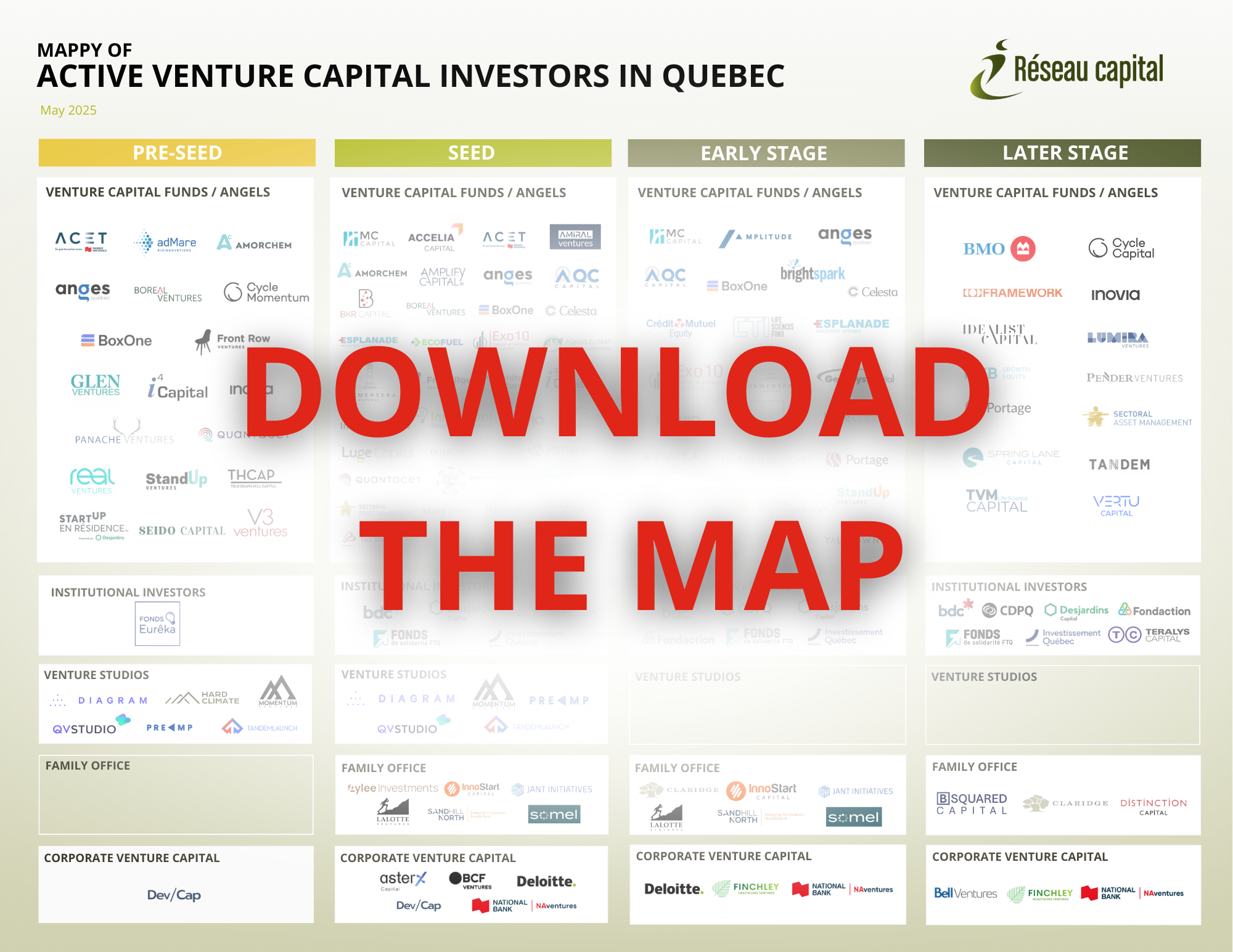 This map, produced by our Centre of Expertise, provides an overview of the various active venture capital investors in Quebec, broken down by investment stage. Whether you’re a novice or an experienced investor, this tool will help you get an overview of the ecosystem at a glance.